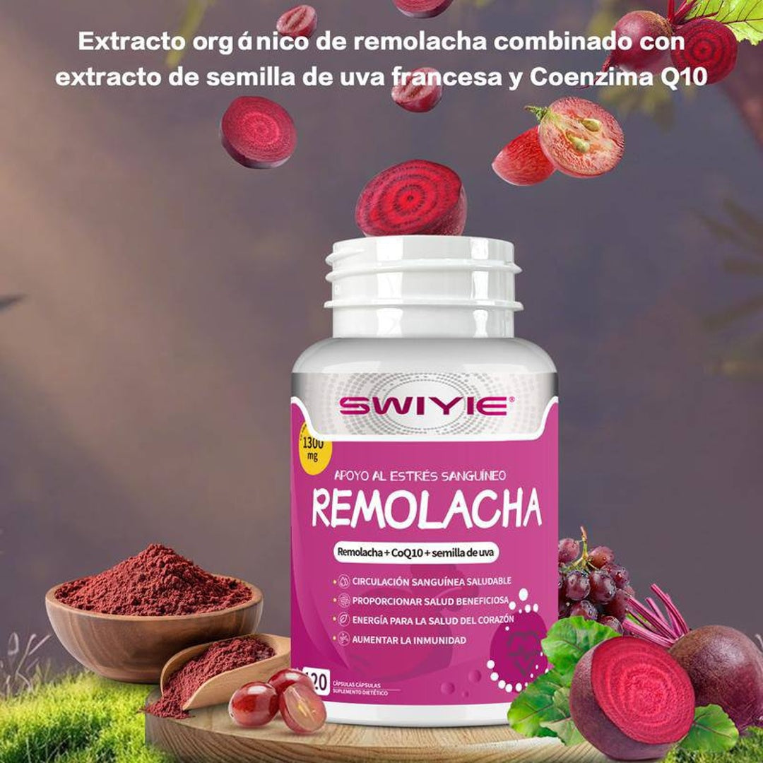 - 🌿 Fórmula natural con Remolacha Orgánica + CoQ10 + Semilla de Uva Francesa