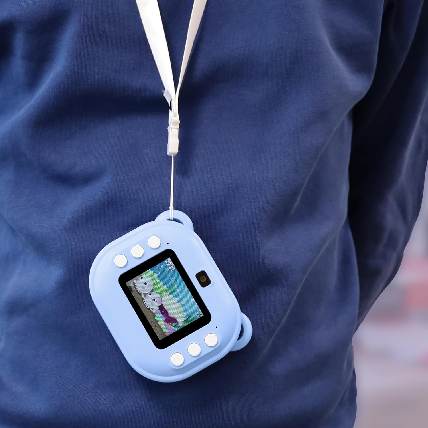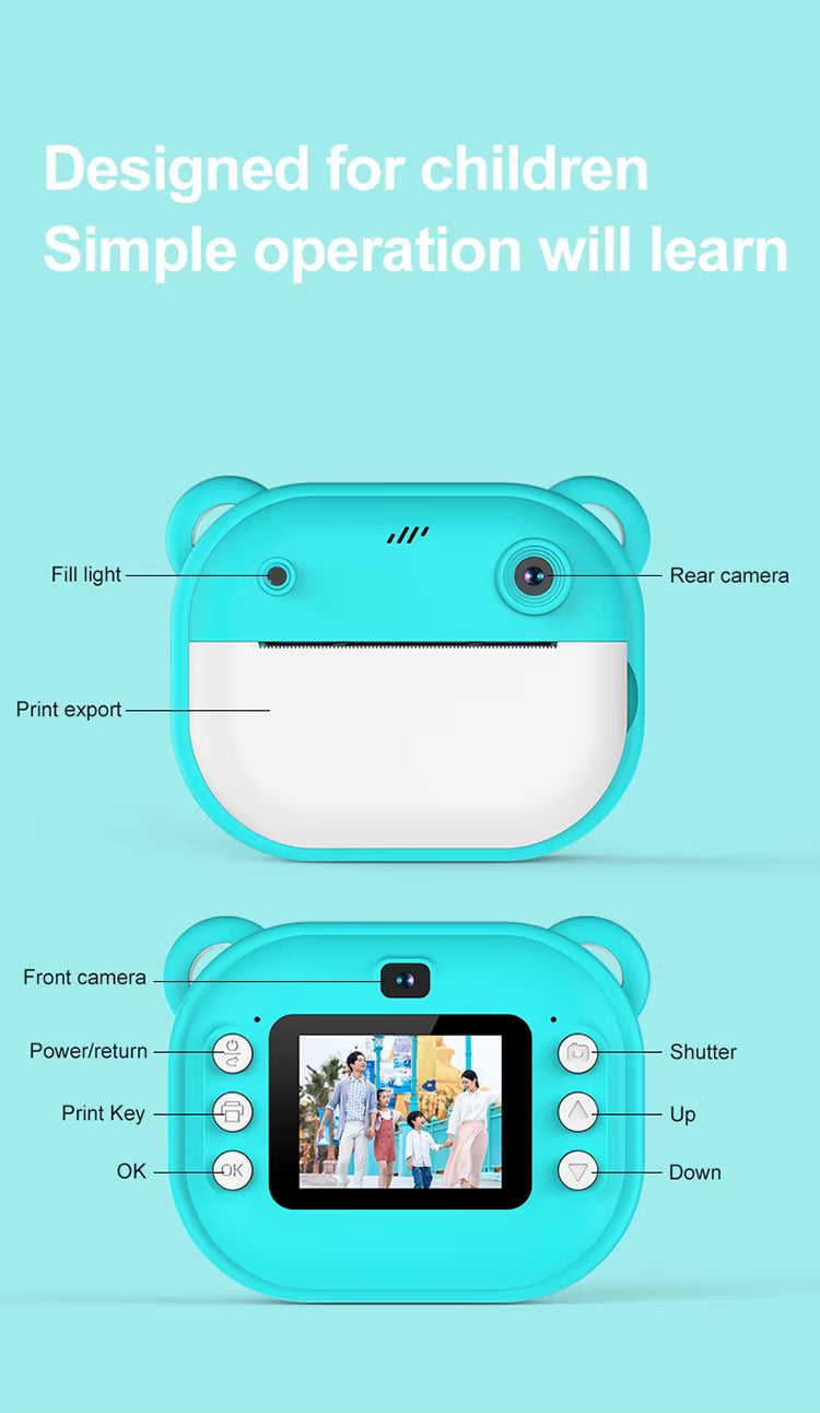 Desde primaria con supervisión básica. Encienden, encuadran en la pantalla a color, toman la foto o graban video y eligen imprimir en B/N con los 18 efectos y marcos si desean. Incluye correa para llevarla segura.