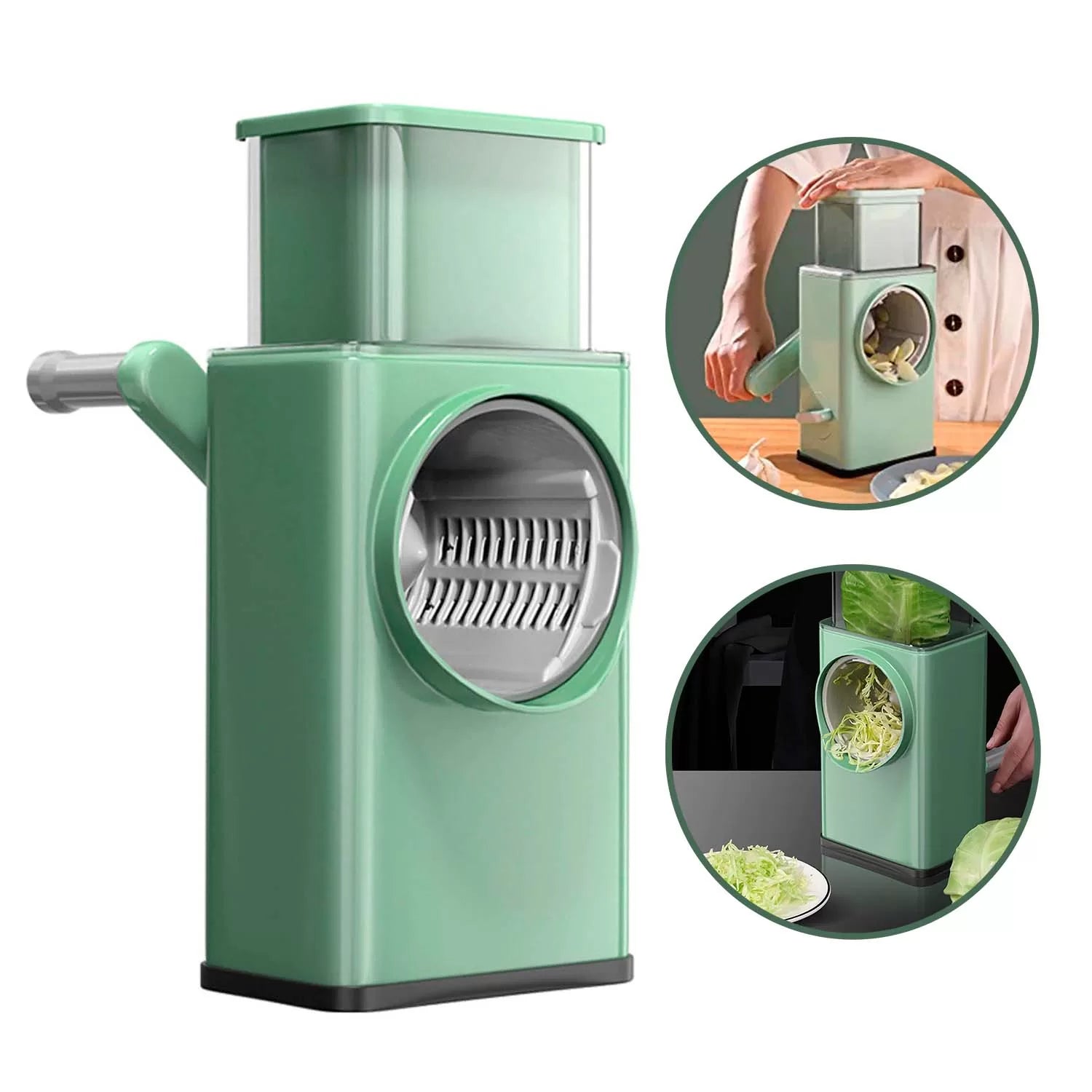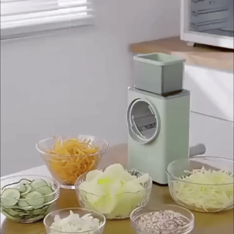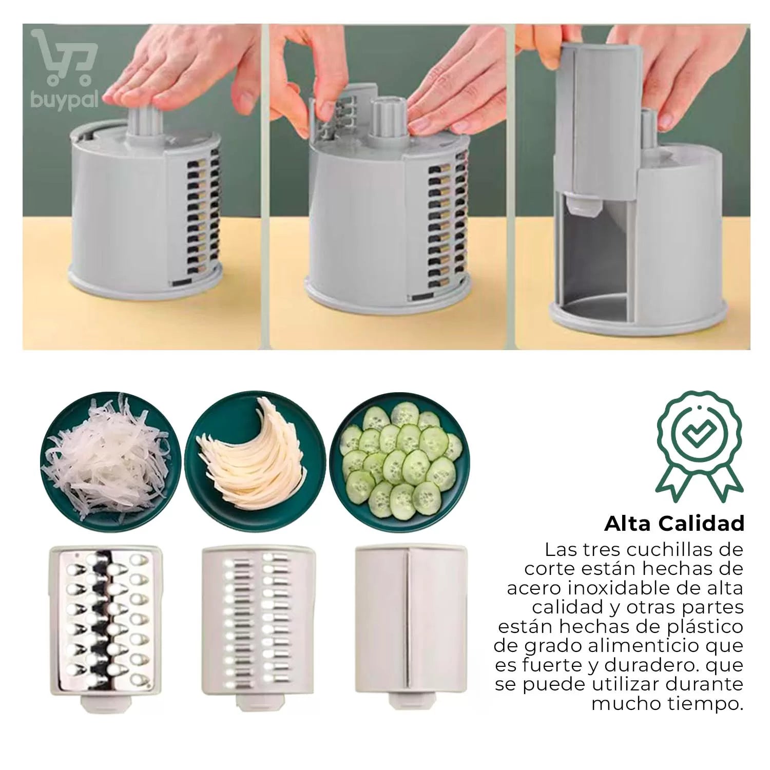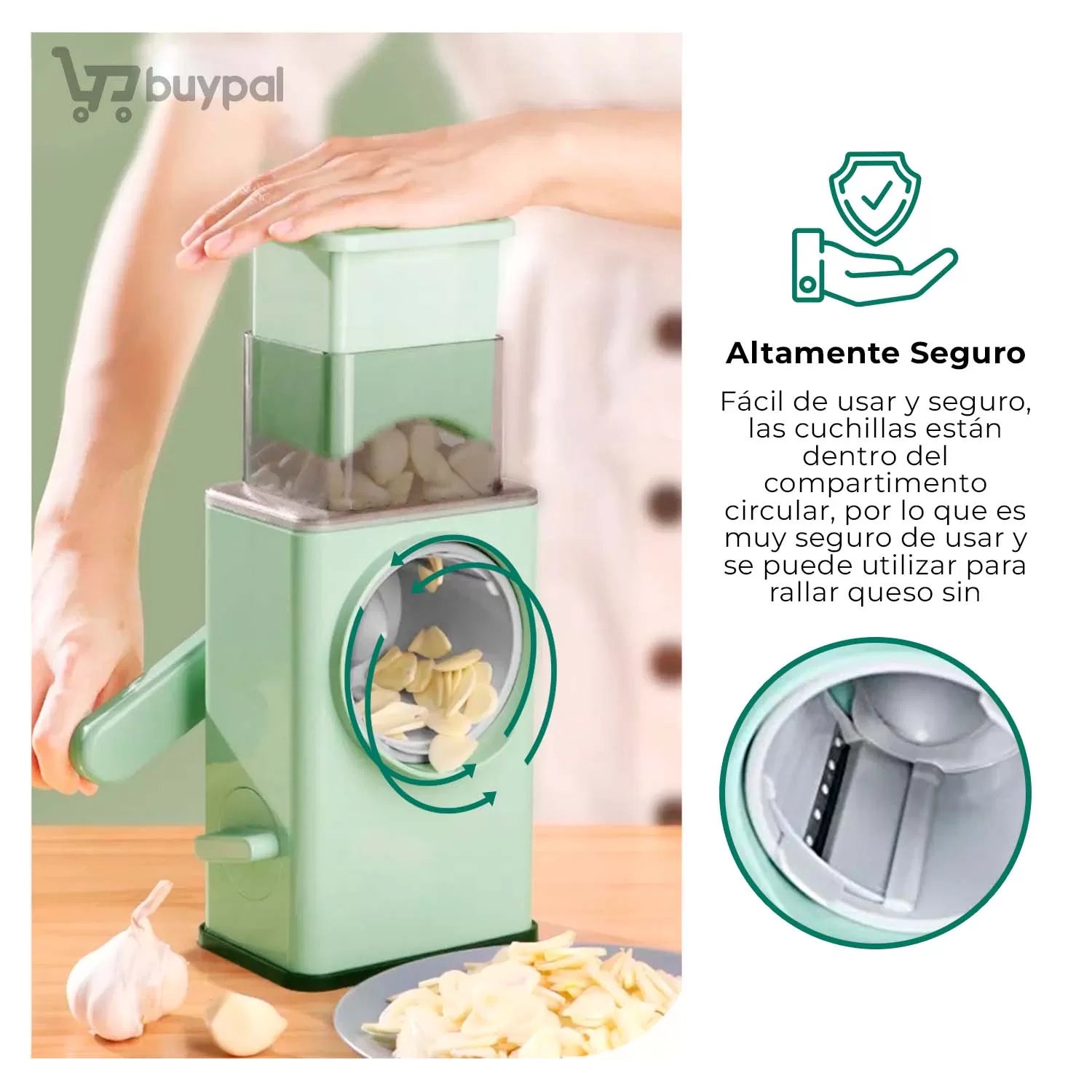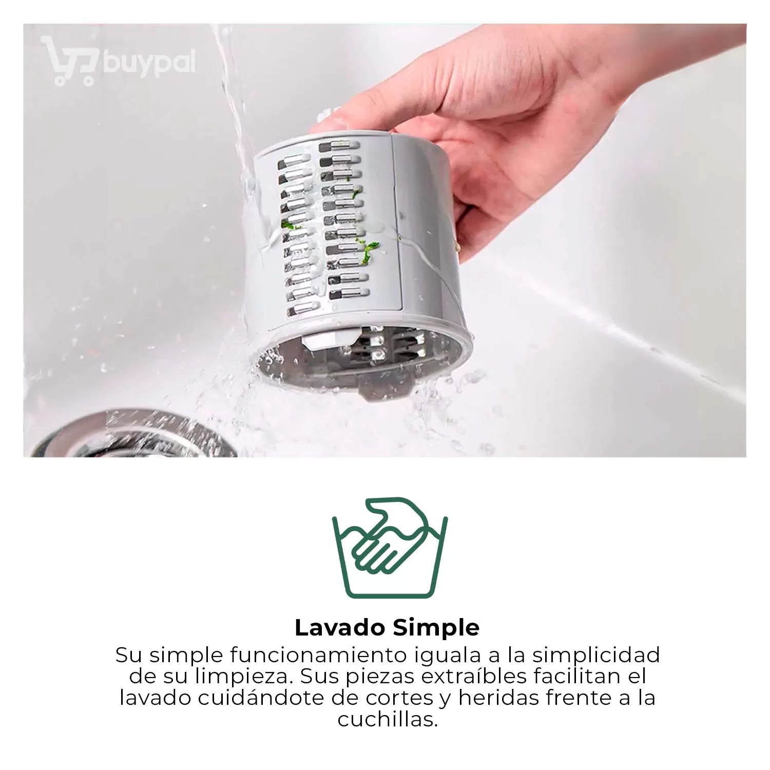 Este cortador multifunción con diseño de tambor giratorio y 3 cuchillas intercambiables te permite procesar grandes cantidades de comida en segundos, sin que tus manos toquen la hoja.