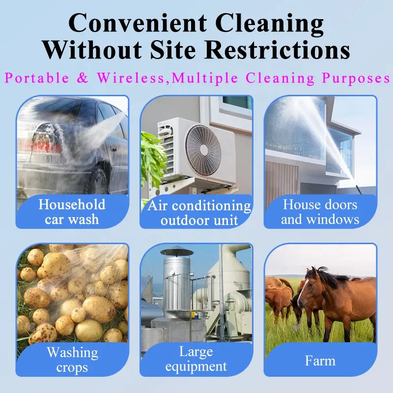 🔧 Potencia portátil y sin complicaciones: su diseño inalámbrico te da libertad total de movimiento. Perfecta para autos, patios, techos y más.