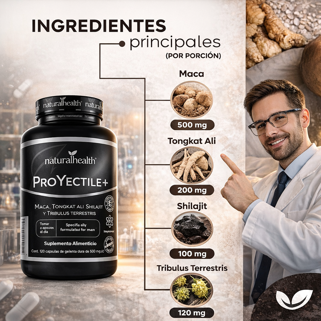 Inspirado en ingredientes ancestrales usados por siglos, ProYectile+™ combina minerales esenciales y compuestos naturales de alto impacto que actúan desde el interior para: